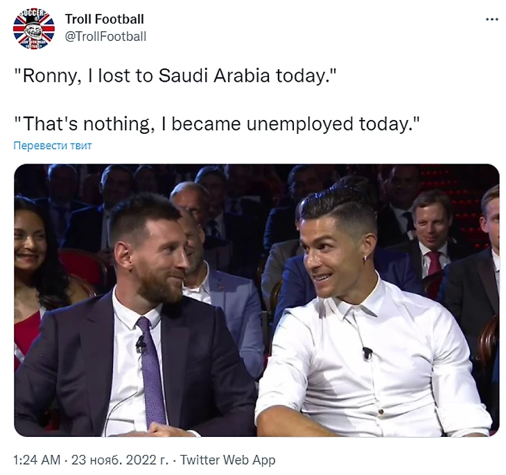 У Месси дела получше, но завидовать нечего – его команда преподнесла главную сенсацию чемпионатов мира за последние 70 лет, проиграв Саудовской Аравии – теперь, прежде чем мечтать о Кубке, желательно хотя бы из группы выйти, а игра аргентинцев к этому явно не располагает.