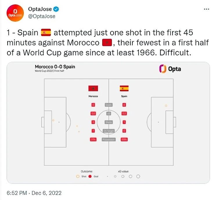 Сборная Испании за первый тайм матча с Марокко в 1/8 финала чемпионата мира смогла нанести всего один удар по воротам соперника – это самый низкий показатель испанцев на турнире с 1966 года.