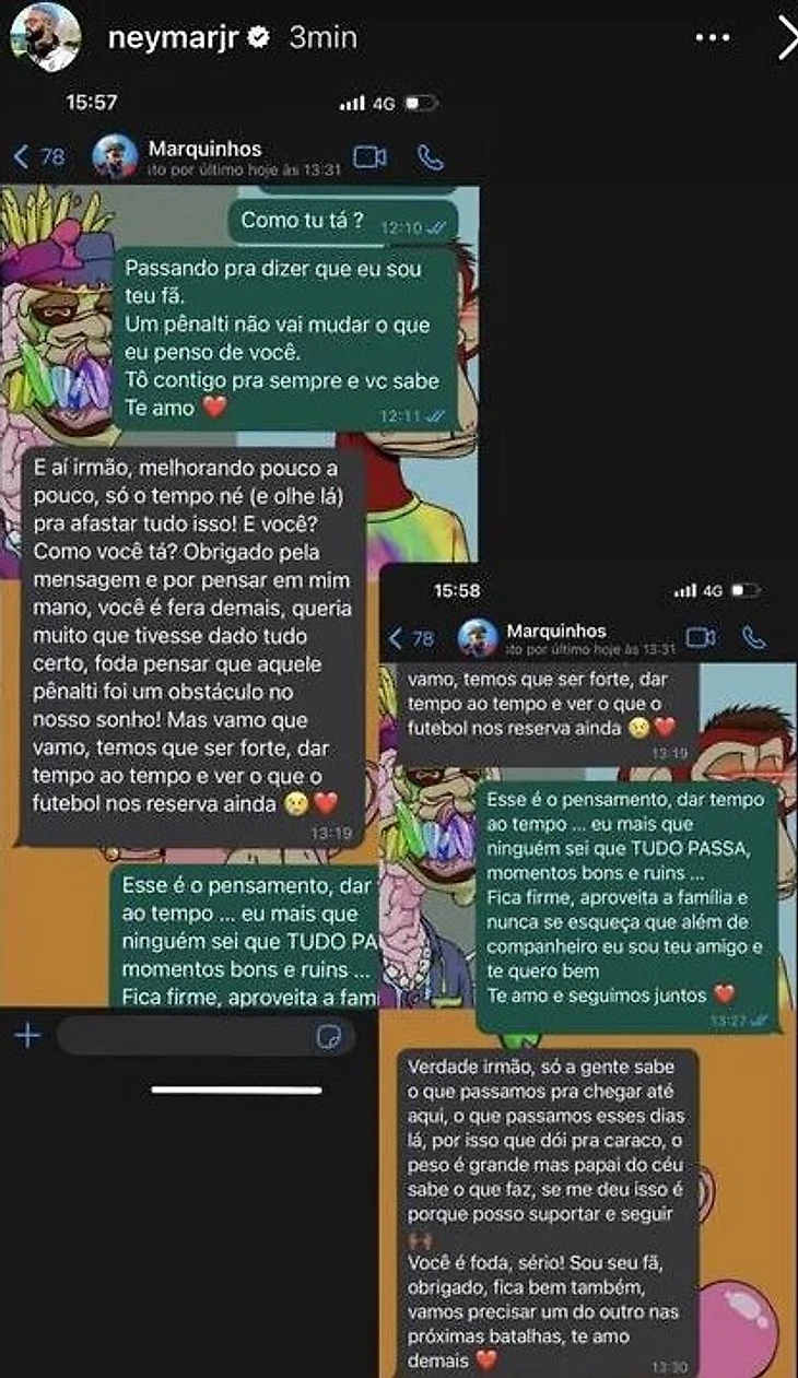 В четвертьфинале чемпионата мира против Хорватии Родриго и Маркиньос не реализовали пенальти – и Бразилия отправилась домой. Некоторое время спустя Неймар поддержал тех, кто не забил пенальти – а также Тиаго Силву и Тите, которые ушли из сборной. И выложил переписку в сторис.