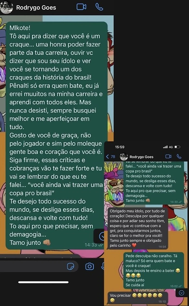 – Я здесь, чтобы сказать, что ты звезда…это честь быть частью твоей карьеры, слышать, как ты говоришь, что я твой кумир и видеть, как ты становишься одной из звезд для истории Бразилии! Не ошибается с пенальти только тот, кто их не бьет – я совершил множество ошибок в карьере, но я учился на них.