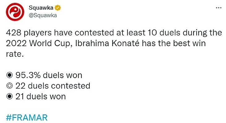 По ходу чемпионата мира в Катаре 428 футболистов приняли участие минимум в 10 дуэлях, но именно Конате лучший по этому показателю: он принял участие в 22 дуэлях и выиграл 21 (95,3%).
