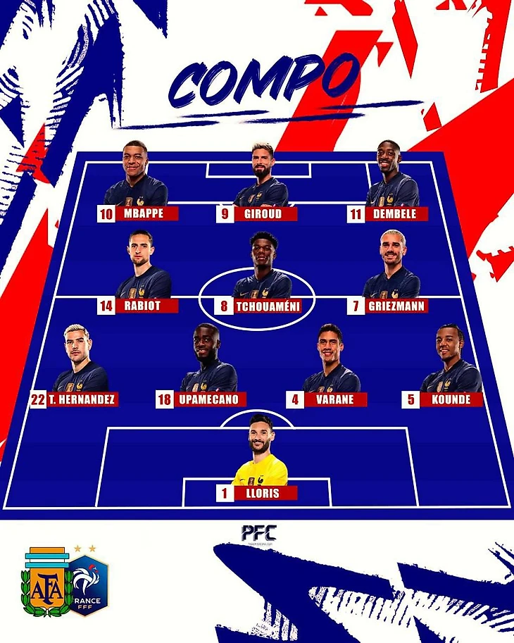 Франция удивила – сообщалось, что Варан и Конате простудились и, вероятно, пропустят финал, однако Рафаэля видим в старте. Тчуамени тоже в старте, так что за центр можно не беспокоиться.