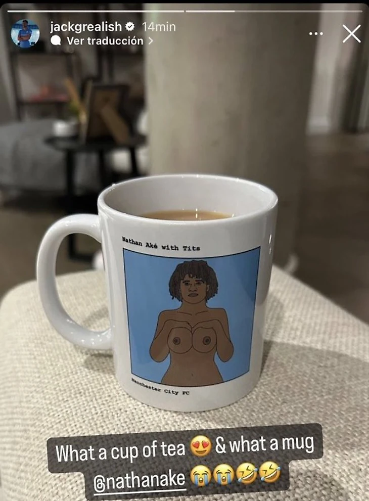 Англичанин решил сфотографировать посуду, из которой пил. Пользователи, которые открыли сториз, сильно удивились тому, что увидели. На кружке был изображен партнер Грилиша по «Сити» Натан Аке, но в довольно странном виде.