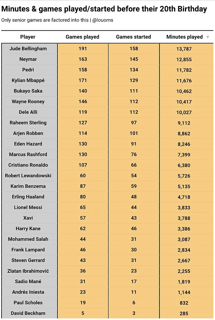 «В последнее время было много дискуссий насчет того, сколько игр в своем возрасте провел Беллингем, − пишет он. − Я решил составить таблицу, состоящую из игроков и того, сколько матчей и минут они провели в аналогичном возрасте. Получилось, что у Джуда в старте 158 игр, тогда как у тех же Дэвида Бекхэма и Пола Скоулза не было даже десяти».