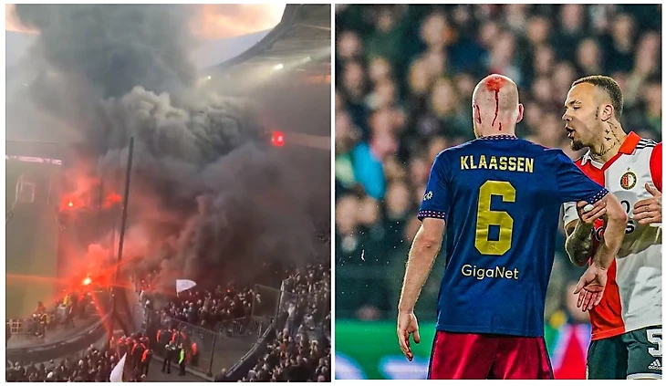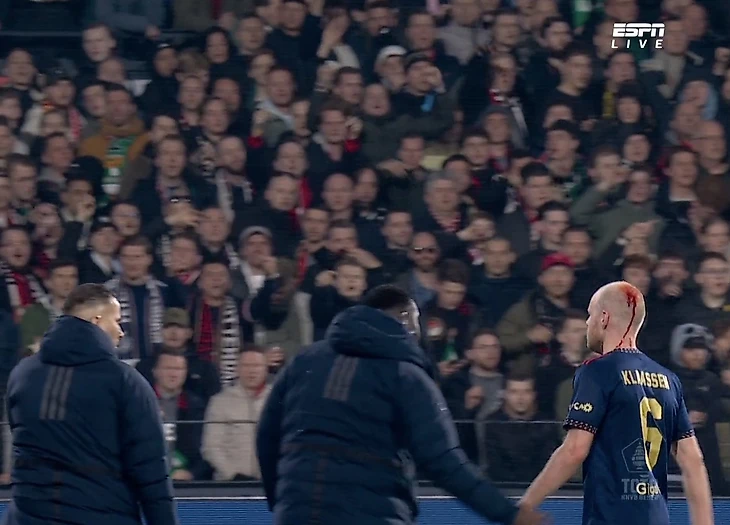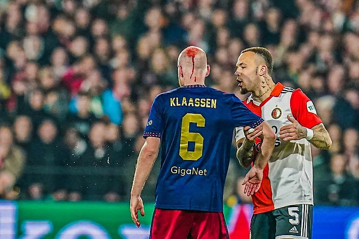 Во время споров между игроками один из фанатов «Фейеноорда» бросил предмет в хавбека «Аякса» Классена и разбил ему голову.