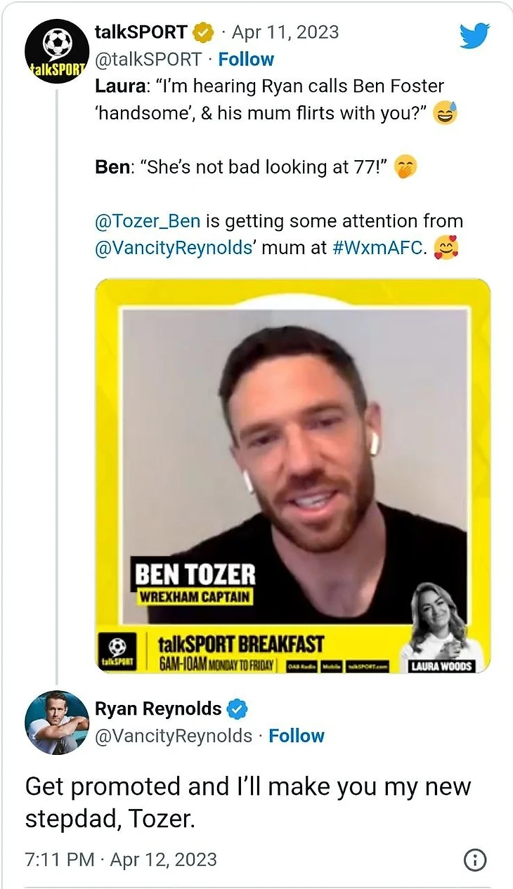 Рейнольдс воспользовался Twitter, где предположил, что Тозер может стать его «новым отчимом», если «Рексхэм» перейдет из Национальной лиги в Лигу2.