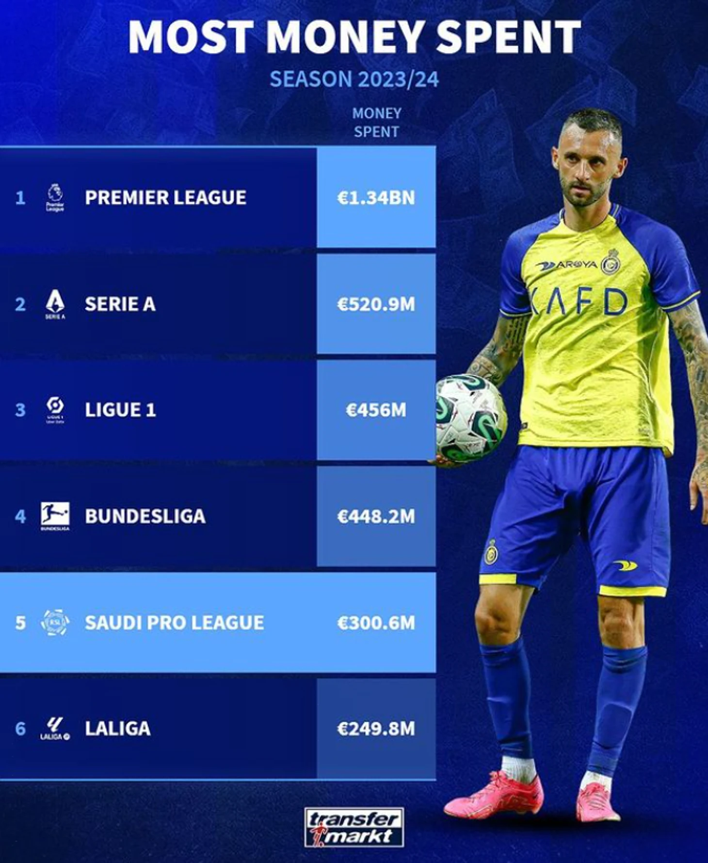 С показателем 300,6 млн евро саудовская лига занимает пятое место по летним тратам на трансферы. Выше нее только АПЛ (1,34 млрд), Серия А (520,9 млн), Лига 1 (456 млн) и Бундеслига (448,2 млн).