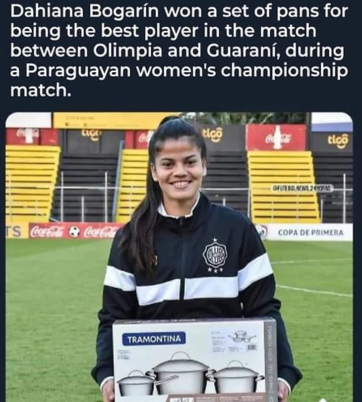 Награда лучшему игроку матча в чемпионате Парагвая среди женщин. Кстати, хорошие кастрюли.