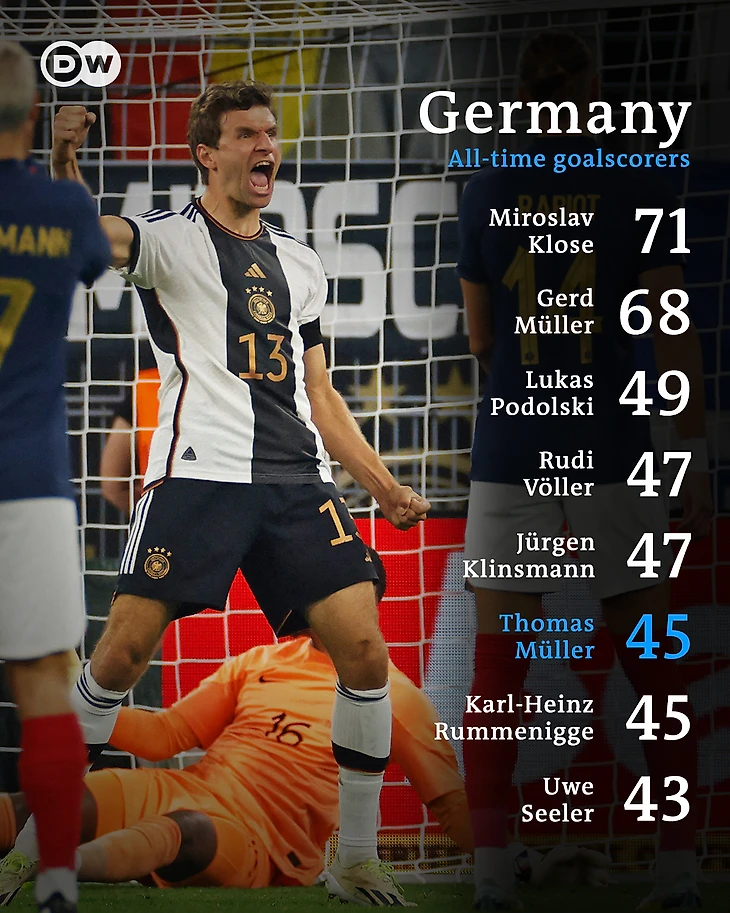 До Миро Клозе, который возглавляет список лучших бомбардиров немецкой сборной, Томасу еще далеко. А вот Лукаса Подольски он вполне может обогнать! Чтобы сместить Польди с третьей строчки, Мюллеру нужно забить еще пять голов.
