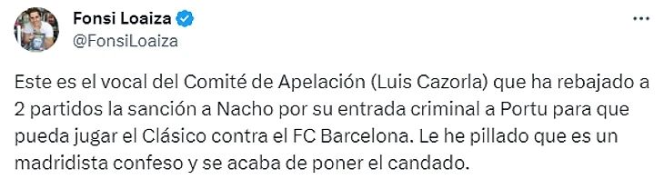 «Это член апелляционного комитета (Луис Касорла), который сократил дисквалификацию Начо до двух игр за его преступный фол, чтобы он мог сыграть в класико против «Барселоны». Я поймал его на том, что он признает себя фанатом «Мадрида», а он просто закрыл профиль».
