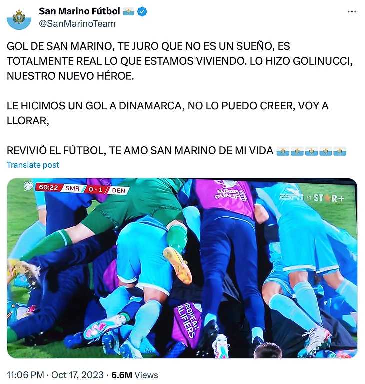 Для понимания масштабов праздника - это реакция официального аккаунта федерации футбола Сан-Марино в соцсетях. 6,6 млн просмотров (население Сан-Марино - 33 тыс. человек).