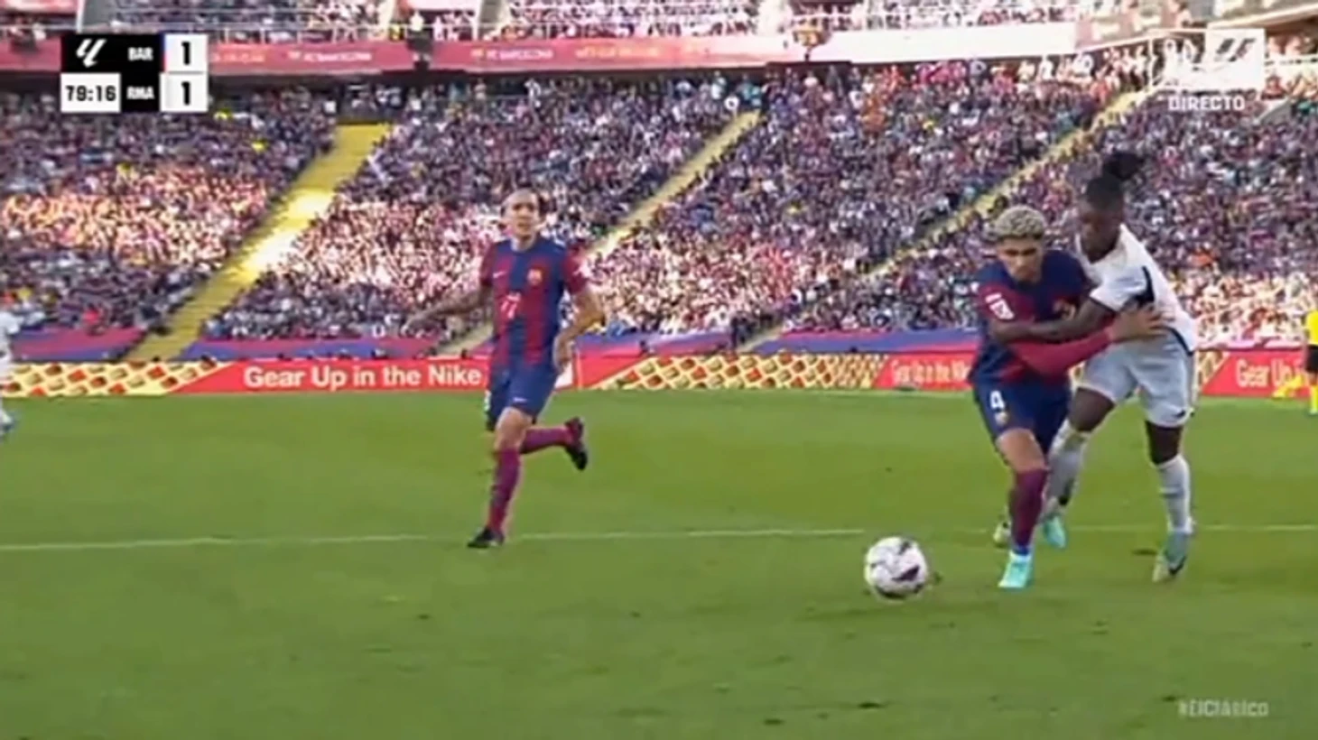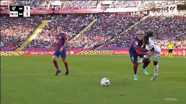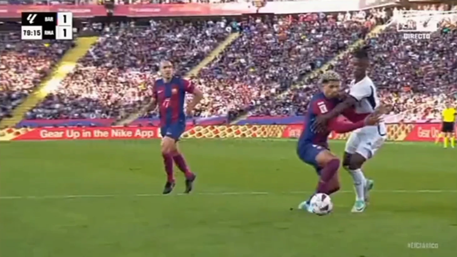 На 79-й минуте игры свежий Эдуардо Камавинга, который появился на 52-й минуте, врывался с фланга в штрафную, но с помощью (или без) защитника «Барсы» Рональда Араухо оказался на газоне.