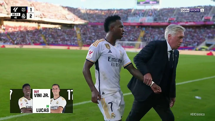В добавленное ко второму тайму класико время Карло Анчелотти решил убрать с поля Винисиуса Жуниора и выпустить Лукаса Васкеса. Бразилец особо не спешил уходить, попутно аплодируя трибунам домашней арены «Барселоны».