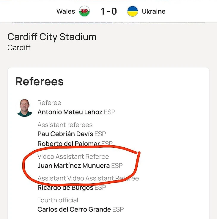 И тут интересно вот что: на ВАР сидел испанский арбитр Хуан Мартинес Мунуера. Этот тот же арбитр, который сидел на ВАР во время стыкового матча за право попасть на ЧМ в Катар между сборными Уэльса и Украины!