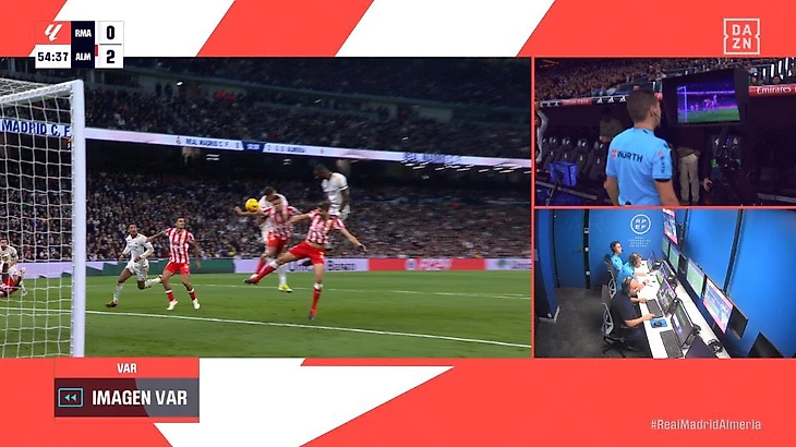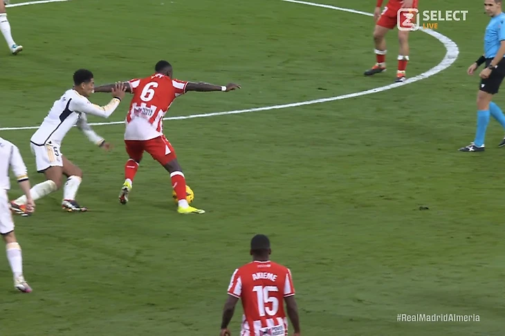 В игру вмешался VAR. После проверки эпизода судья Франсиско Эрнандес Маэсо отменил гол, усмотрев фол в атаке: Дьон Лопи отмахнулся от Беллингема, ударив англичанина по лицу. За это нарушение полузащитник «Альмерии» получил желтую.