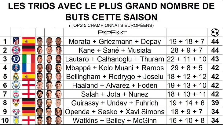 Такое же количество голов, как и у испанца, француза и нидерландца − 44, забили футболисты «Баварии» Харри Кейн, Лерой Сане и Джамал Мусиала. Однако в отличии от представителей испанского клуба, у мюнхенцев есть ярко выраженный бомбардир.