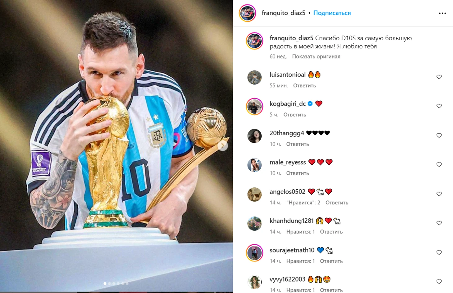 Но главный пост оказался в закрепленном. Нужно ли объяснять, что происходит на фото? Дата − 20 декабря 2022 года. Один из лучших (или лучший?) день в жизни каждого аргентинца. И Франко Диаса тоже.