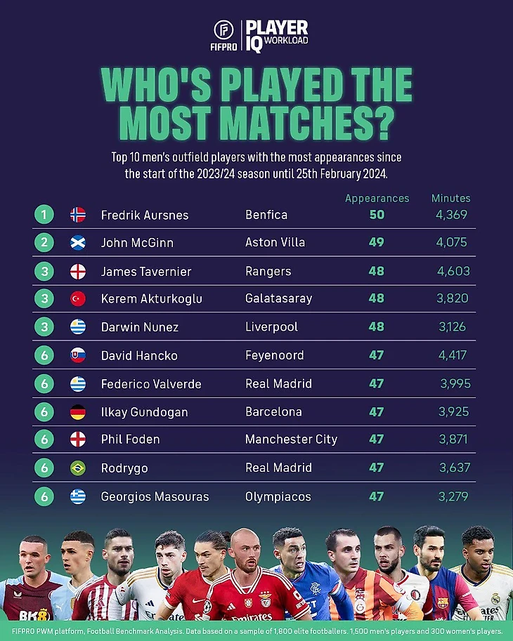 Международная федерация ассоциаций профессиональных футболистов (FIFPro) поделилась занятной статистикой. В удобной графике собрали топ-11 игроков, которых наиболее часто задействуют в их клубах. Данные актуальны на 25 февраля 2024 года, но они все равно дают общее представление об игровой нагрузке.