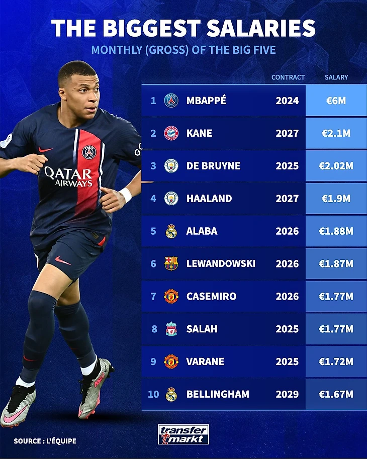 Килиан Мбаппе занял первое место в общеевропейском зарплатном рейтинге. «ПСЖ» в месяц платит капитану сборной Франции 6 млн евро до удержания налогов – и это учитывая, что его контракт с парижанами истекает уже этим летом.
