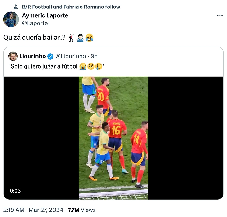 😡 Винисиус ударил Лапорта локтем в спину во время матча Испания – Бразилия. Эмерик ярко ответил бразильцу в соцсетях 💣