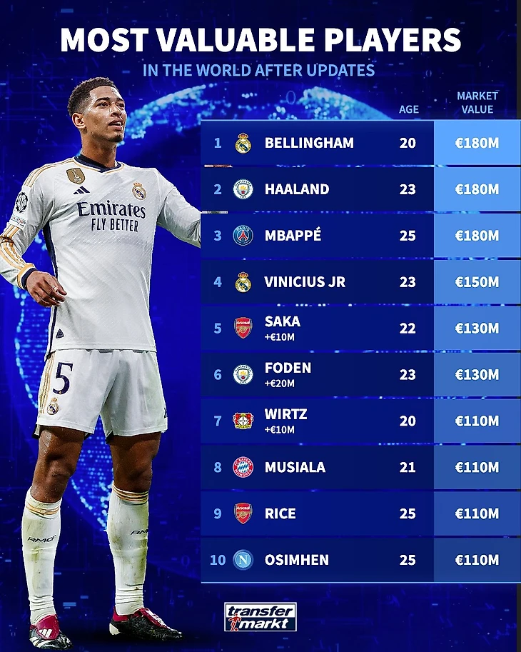 Самым подорожавшим футболистом стал Фил Фоден, теперь по рыночной стоимости он сравнялся с Букайо Сака. Подорожал и Флориан Виртц из леверкузенского «Байера». Он, как и Джамал Мусиала, теперь стоит 110 млн евро. Компанию немецкой молодежи составили Деклан Райс и Виктор Осимхен, за которых тоже придется заплатить 110 млн.