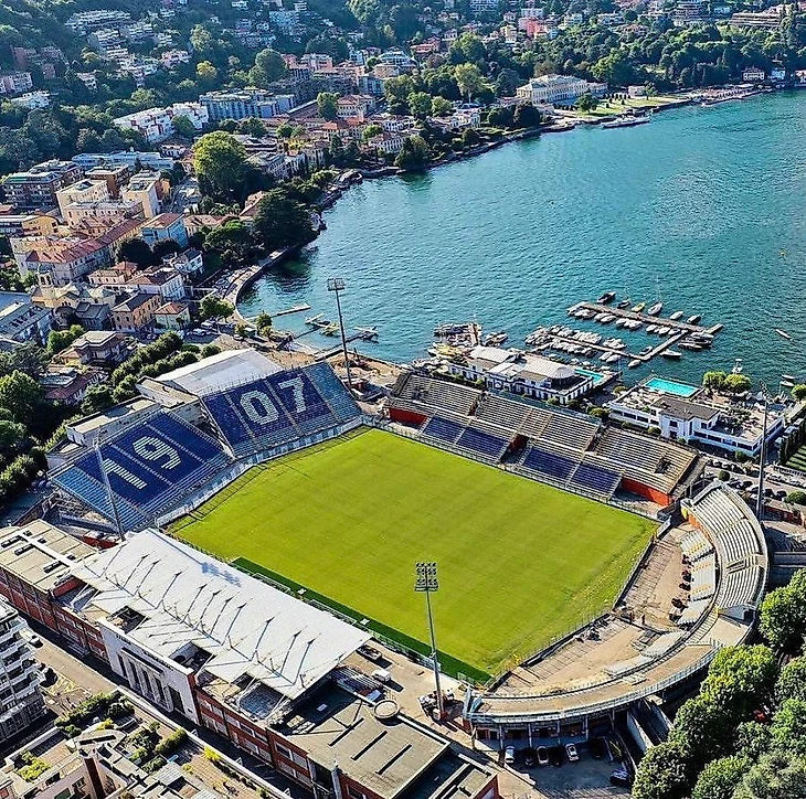 «Комо» сейчас идет вторым в серии Б с 71 набранным баллом, отрыв от 3-его места 4 очка, сыграть осталось всего 2 тура. Если в этих 2 матчах клуб одержит хотя бы одну победу, в следующем сезоне матча чемпионата Италии можно будет наблюдать с трибун вот такого волшебного стадиона, расположенного прямо на берегу знаменитого озера..