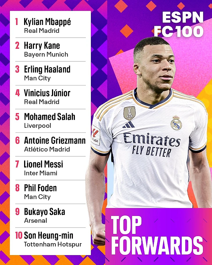 ESPN составил список 100 лучших игроков мира, разделив его на 4 рейтинга по позициям: 10 лучших вратарей и по 30 лучших защитников, полузащитников и нападающих. В голосовании приняли участие более 50 журналистов.
