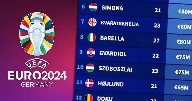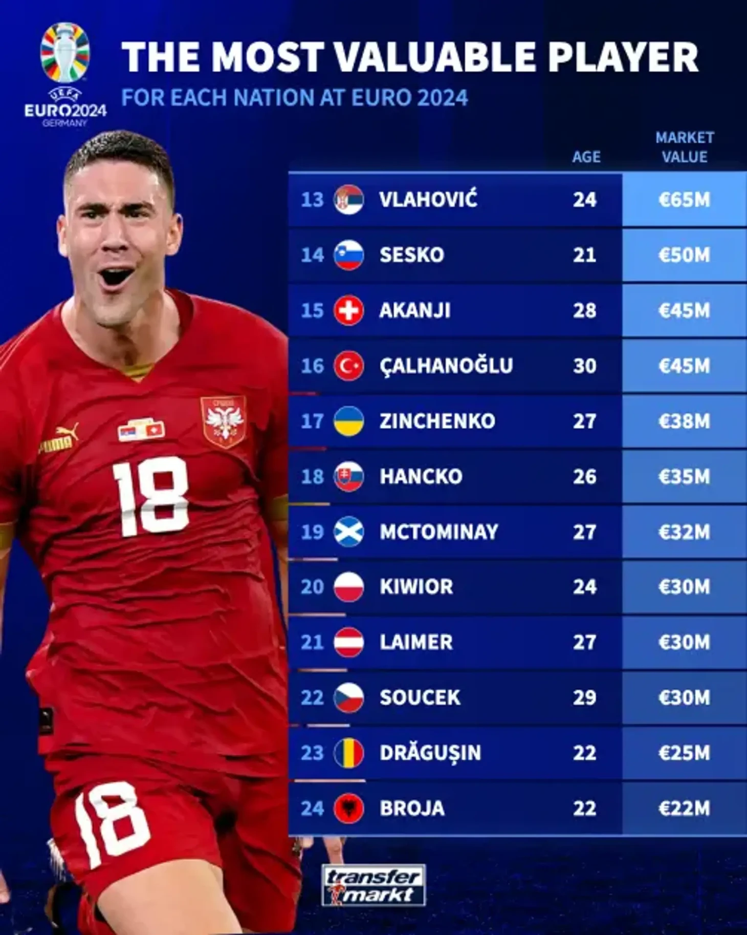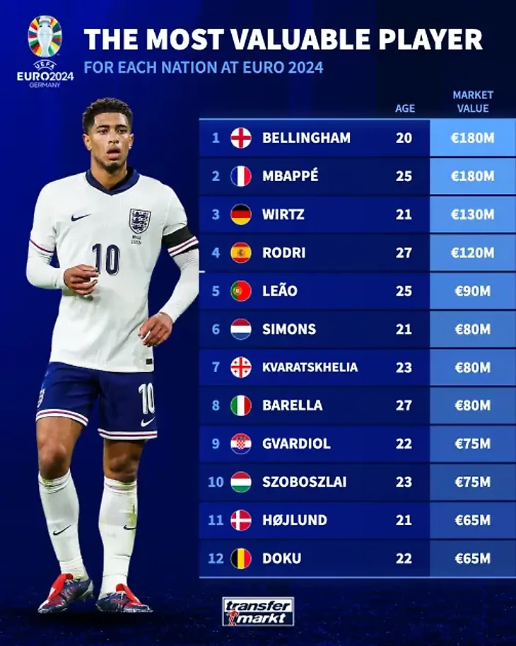 Transfermarkt определил и составил рейтинг MVP каждой из 24 стран-участниц (по рыночной стоимости). В этом рейтинге выделены игроки, чьи выступления могут сыграть решающую роль в успехе их страны на Евро.