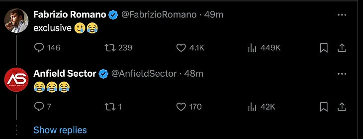 Инсайдер решил подколоть крупный портал Anfield Sector, заявивший в соцсетях, что Федерико Кьеза интересует «Ливерпуль». Дело в том, что издание назвало информацию своим эксклюзивом. А Романо писал об этом несколькими часами ранее.
