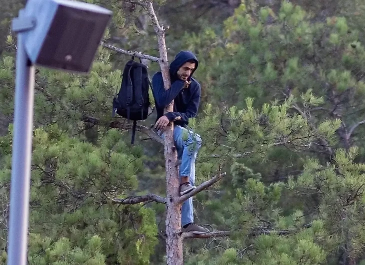 Один из болельщиков нашел интересное место для просмотра - он залез на высокое дерево возле стадиона.
