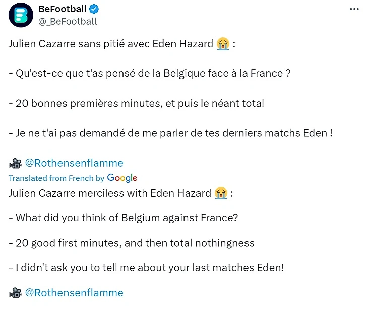 «Что я думаю о бельгийцах против Франции? Первые двадцать минут были хорошими, а потом совершенно ничего», - заявил Эден Азар комику Жюльену Казару, который брал у него интервью.