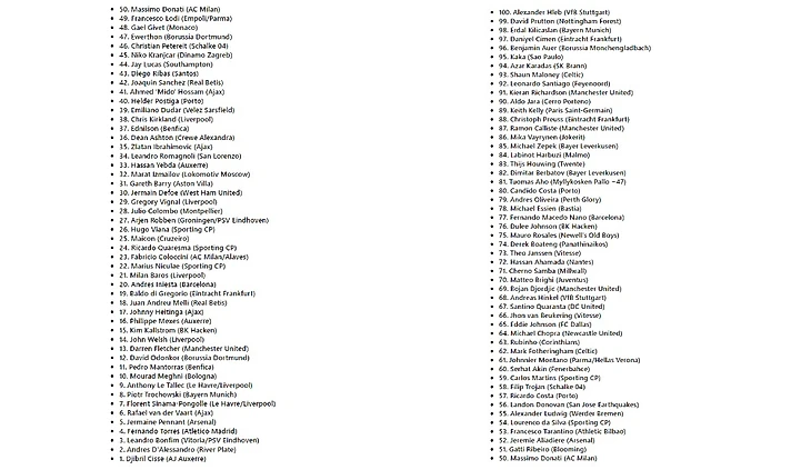 Жереми Алиадьер из «Арсенала» − 52-й, а будущая легенда сборной США Лэндон Донован на четыре места ниже. Культовые игроки АПЛ Нико Кранчар и Мидо не вошли в число 40 лучших − 41 и 45 места.