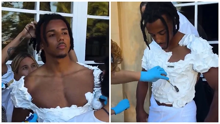 Фотосессия защитника «Барсы» Жюля Кунде для бренда Jacquemus наделала шума. Француз примерил ряд необычных образов, один из них – наряд из пены для бритья. На что это похоже - решайте сами.