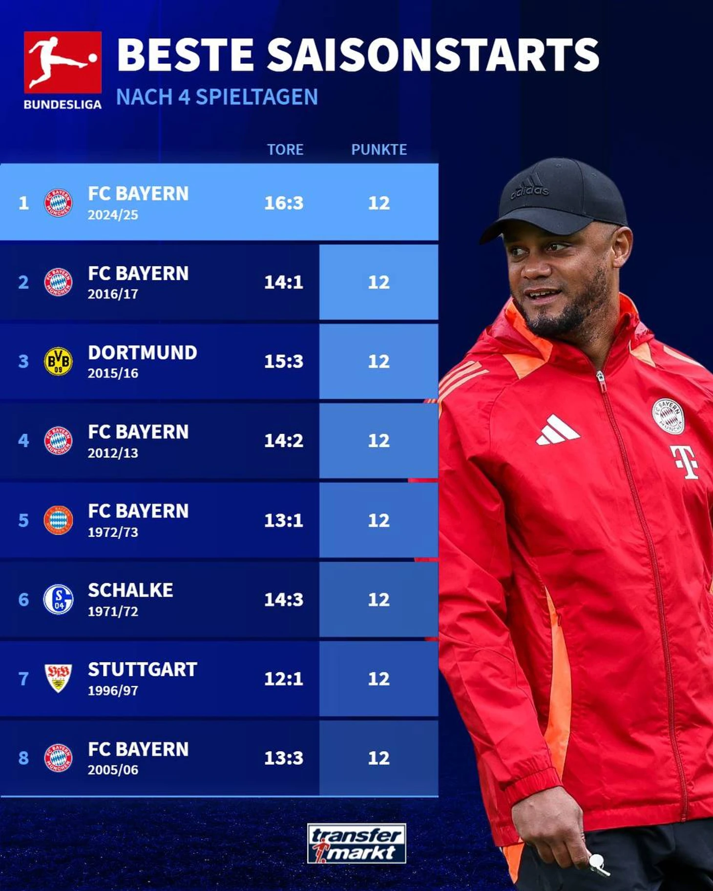 «Бавария» все больше напоминает прежнюю себя. После провального сезона-2023/24 команду возглавил Венсан Компани, плоды работы молодого тренера уже заметны. Мюнхенцы выдали лучший старт в истории Бундеслиги после четырех туров – 12 очков и разница мячей 16:3.
