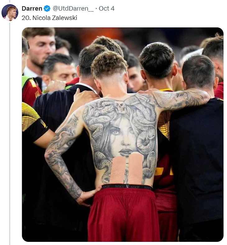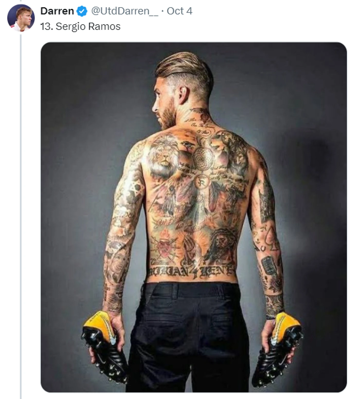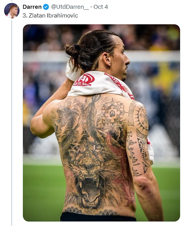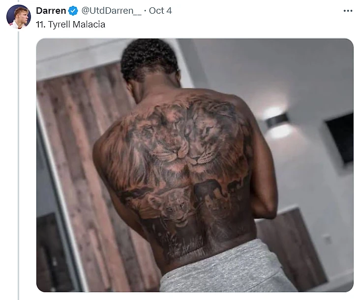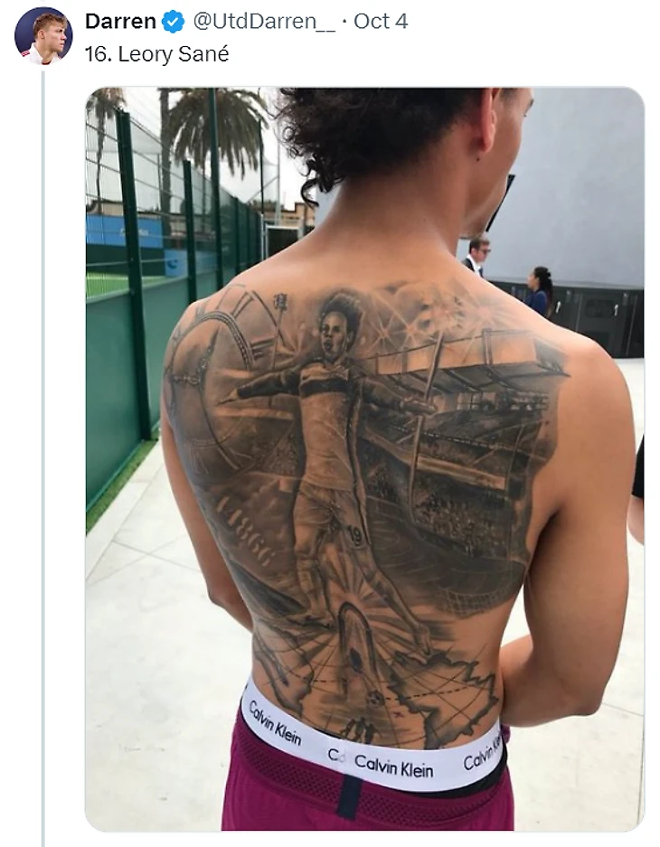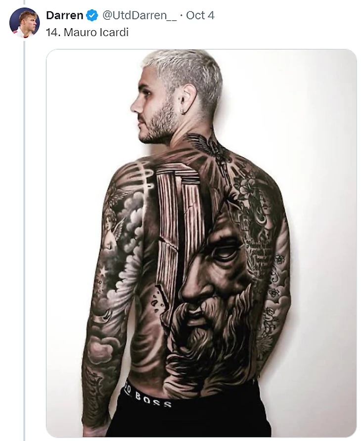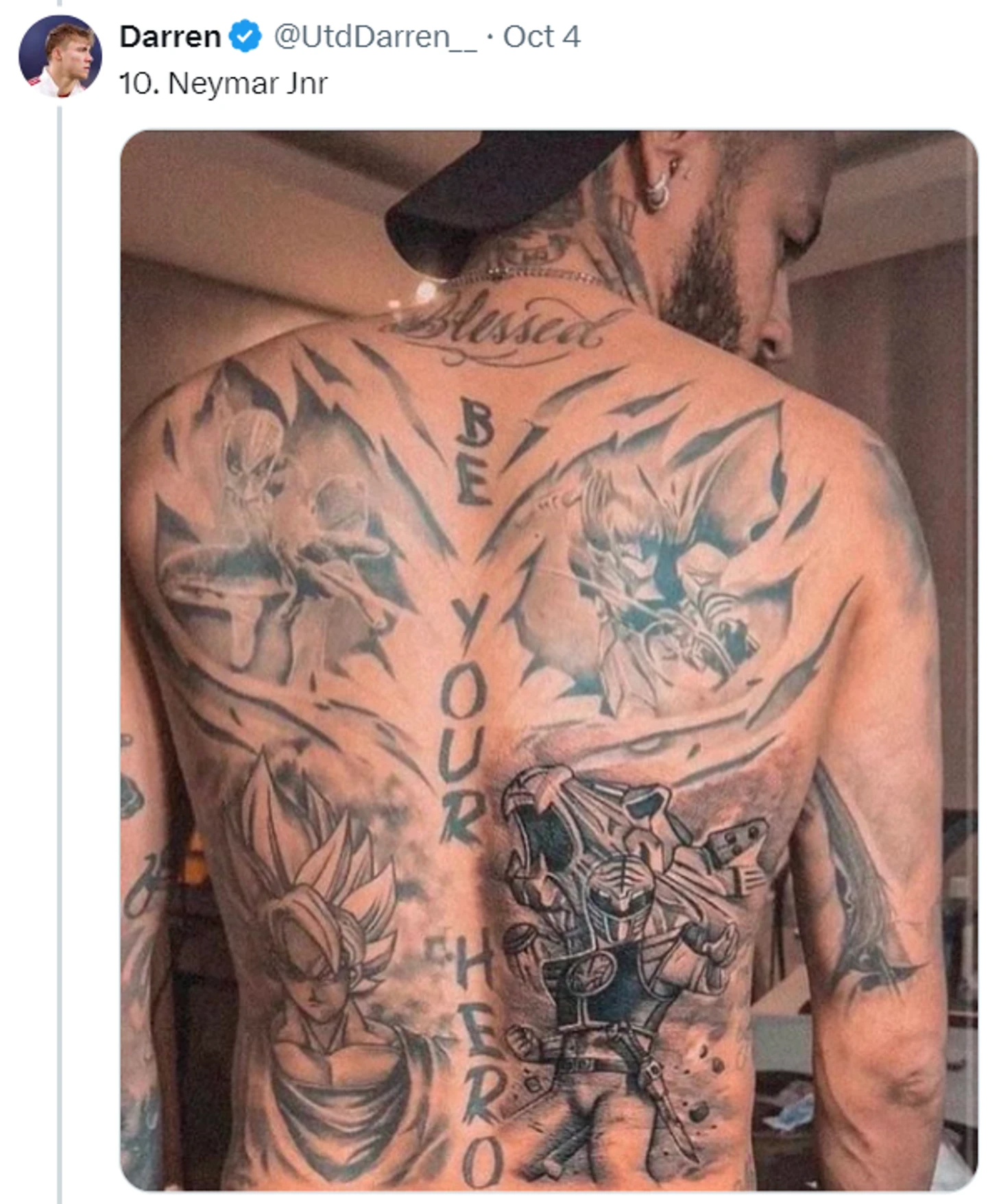 Пользователь X под ником @UtdDarren__ составил тред футболистов с самыми крутыми татуировками на спине. Выяснилось, что игроки предпочитают набивать морды львов, лица кумиров, лики святых и свои собственные портреты.