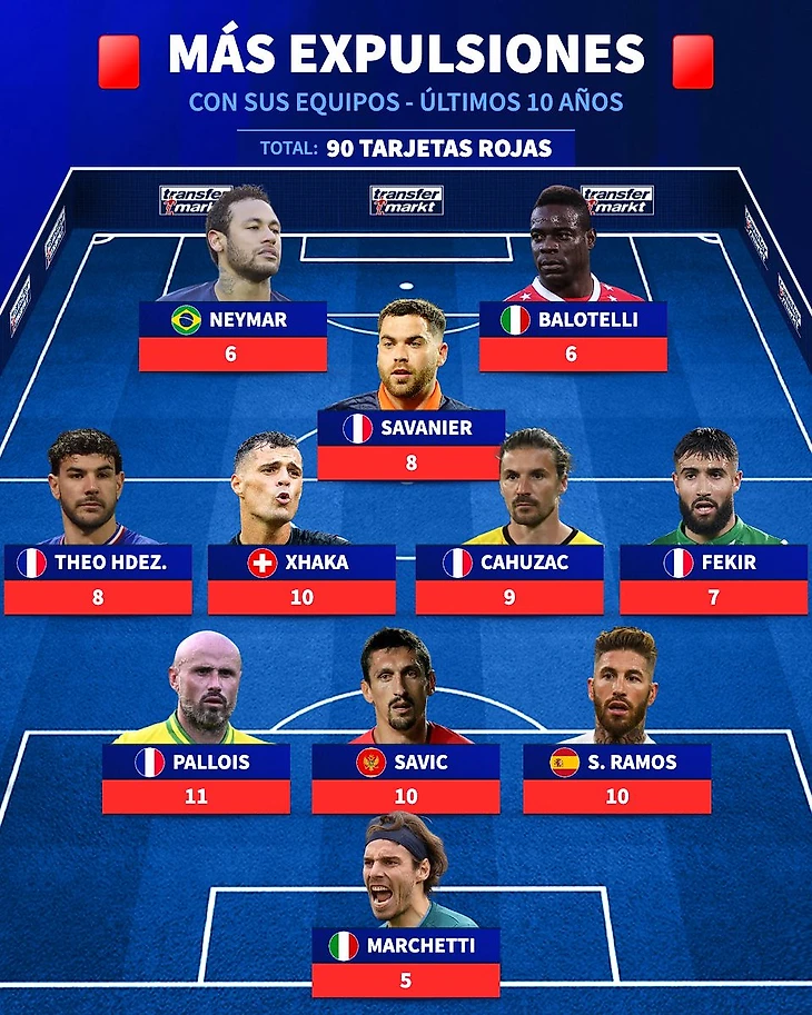 Специализированный портал представил команду из лидеров по количеству красных карточек за карьеру за последние 10 лет. Одиннадцать игроков собрали общими усилиями сразу 90 удалений!