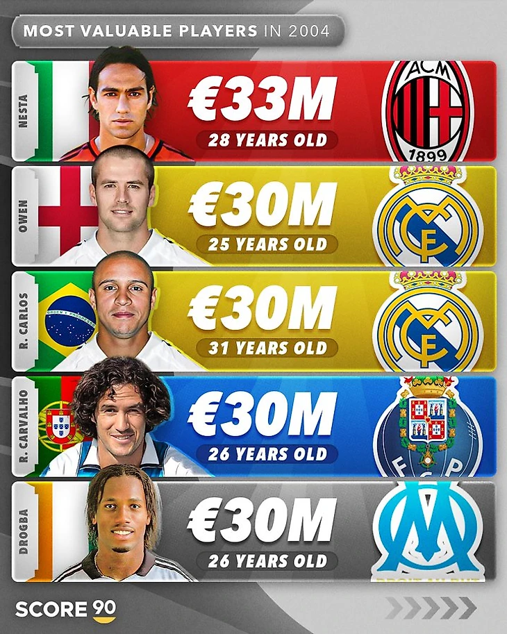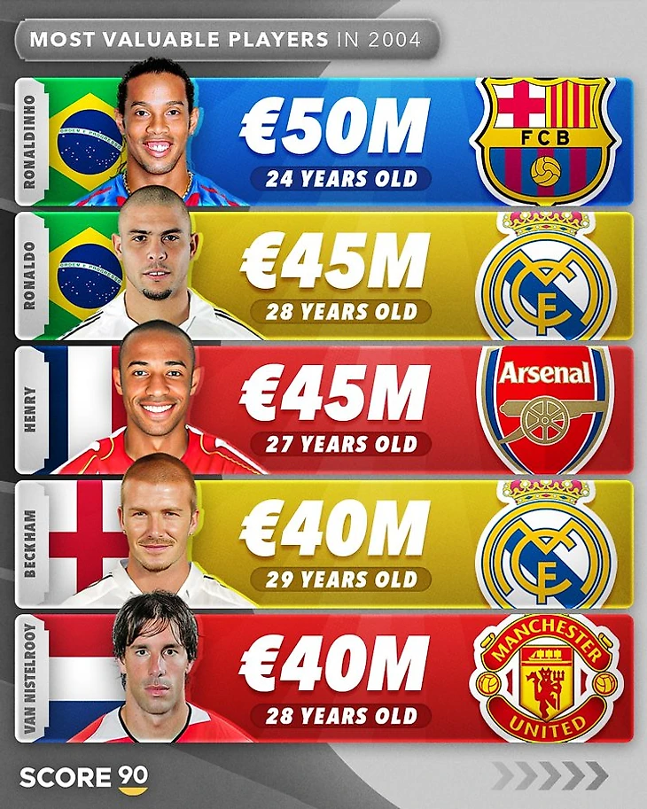 Вот самые дорогие футболисты на 2004 год (по данным Score90).