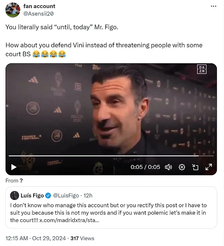 MadridXtra, самый популярный аккаунт про мадридский «Реал» в социальной сети Х с аудиторией в 1,5 млн подписчиков, привел слова португальца: «До сегодняшнего дня «Золотой мяч» считался престижной наградой». Фигу это совершенно не понравилось, он опубликовал обращение, в котором пригрозил владельцу аккаунта судом за искажение его слов.