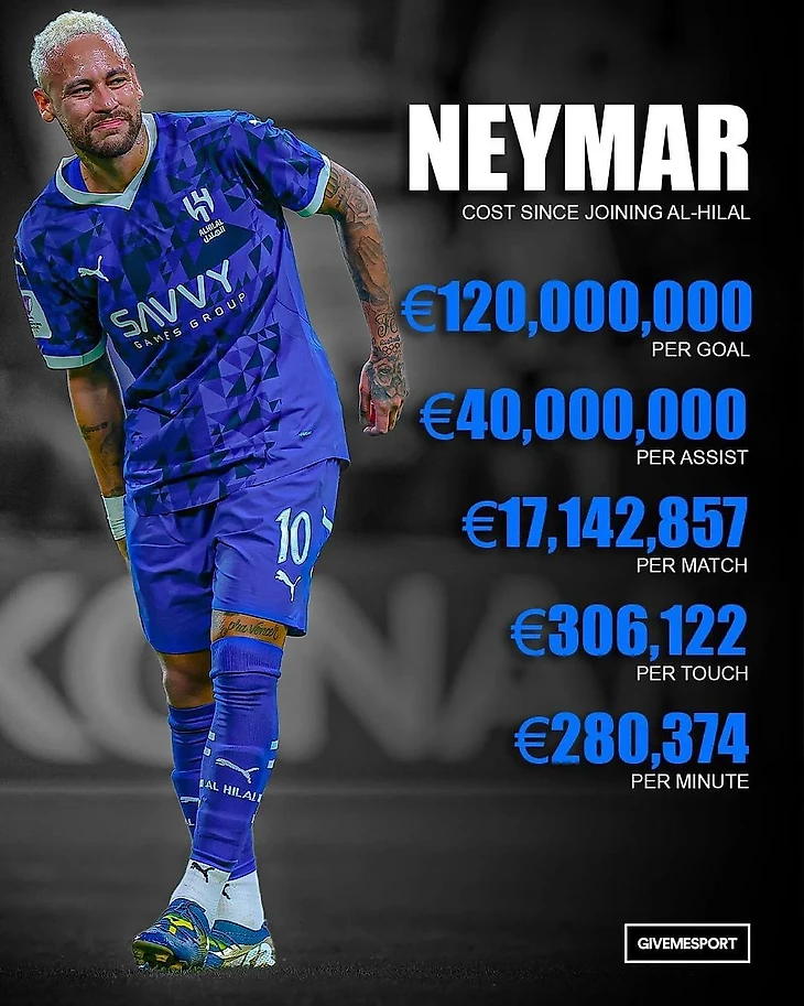 Спустя год форвард вернулся на поле, но снова повреждение, на этот раз бедро и сроки в 4-6 недель. Саудовцы уже задумались о расторжении контракта. Но во сколько уже обошелся Неймар «Аль-Хилалю»? Посчитали в GiveMeSport.