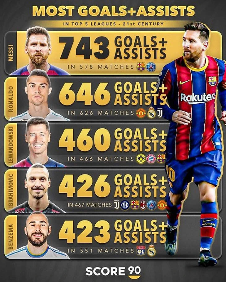 Портал Score90 составил пятерку лучших игроков XXI века по гол+пас. В рейтинг попали результаты футболистов, выступавших в топ-5 лиг Европы.