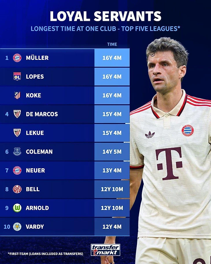 Первое место поделили Томас Мюллер, Антони Лопеш и Коке – эти парни провели в своих клубах по 16 лет и 4 месяца – всю свою профессиональную карьеру. Они продолжают выступать за «Баварию», «Лион» и «Атлетико», соответственно.