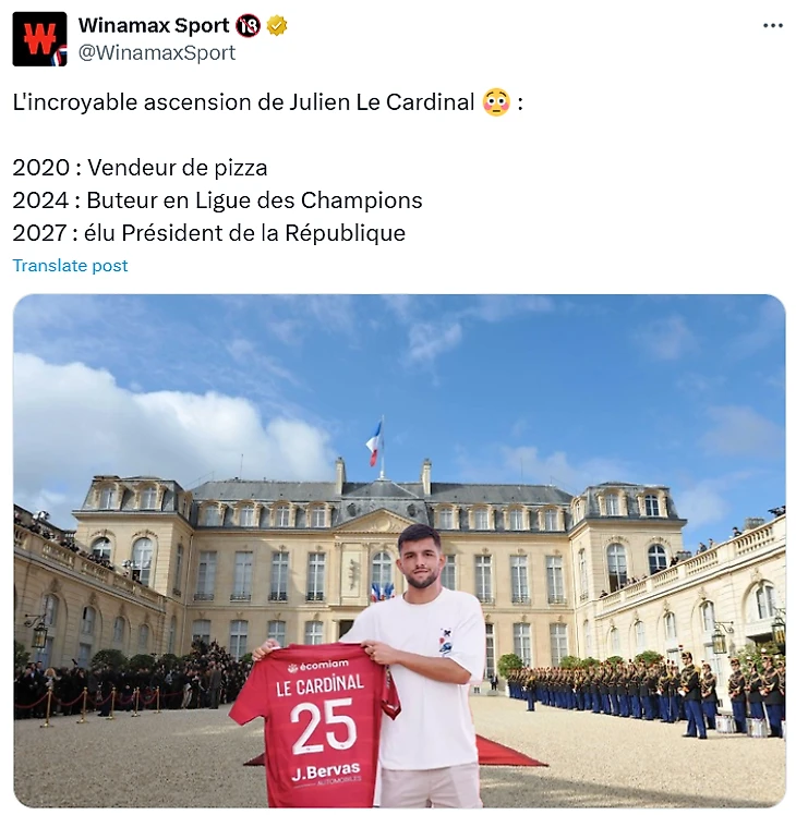 «Невероятное восхождение Жюльена Ле Кардиналя 😳 2020 год: продавец пиццы. 2024 год: бомбардир Лиги чемпионов. 2027 год: избран президентом Республики»