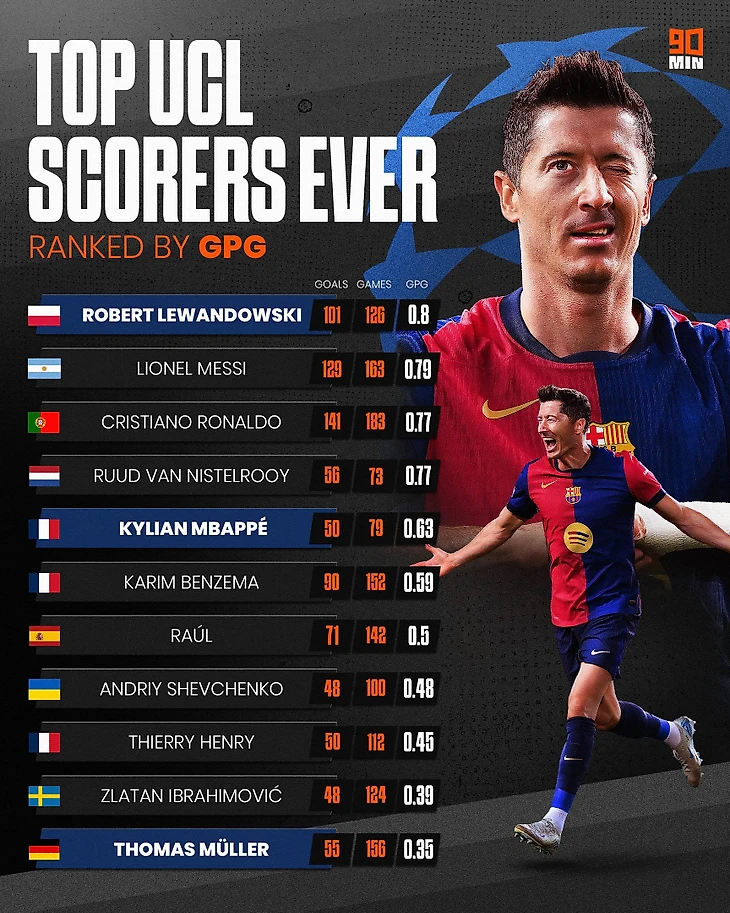 Поляк забил 101 гол, что позволило ему занять третью строчку в рейтинге лучших бомбардиров в истории турнира. Нападающего опережают двое: Лео Месси (129 голов) и Криштиану Роналду (141 гол). Все же Роберт обходит легенд по одному показателю – среднее количество голов за матч.