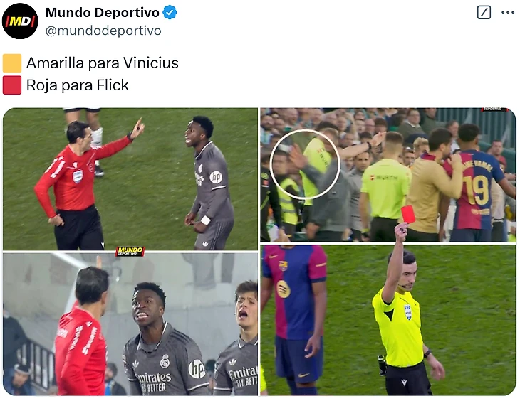 💭 «Винисиус агрессивно кричит на арбитра, но получает только желтую. Левандовского удалили за то, что он потрогал нос. Флик получил красную за то, что поднял руку. После этого фанаты «Мадрида» жалуются на то, что им не дали пенальти, хотя в том эпизоде Винисиуса по ноге ударил Беллингем».