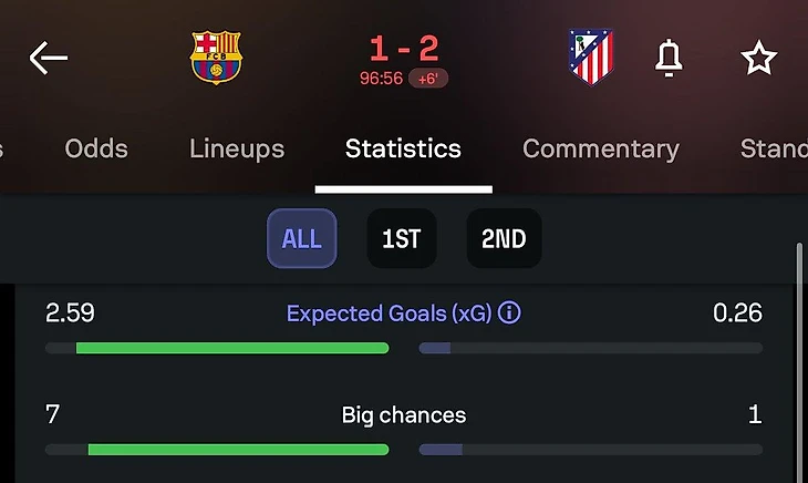 Этот результат невероятен, так как статистика, в отличие от табло, подчеркивает доминирование «Барселоны»: целых 2,59 xG и 7 моментов против 0,26 xG и одного момента у соперника.