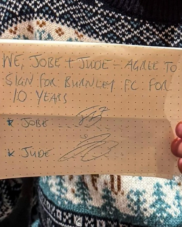 На этом история не закончилась. Предприимчивый паренек подсунул бумажку Беллингемам так, что смог выше дописать текст от себя. Так Джуд и Джоб на ближайшие десять лет подписали контракт с «Бернли».