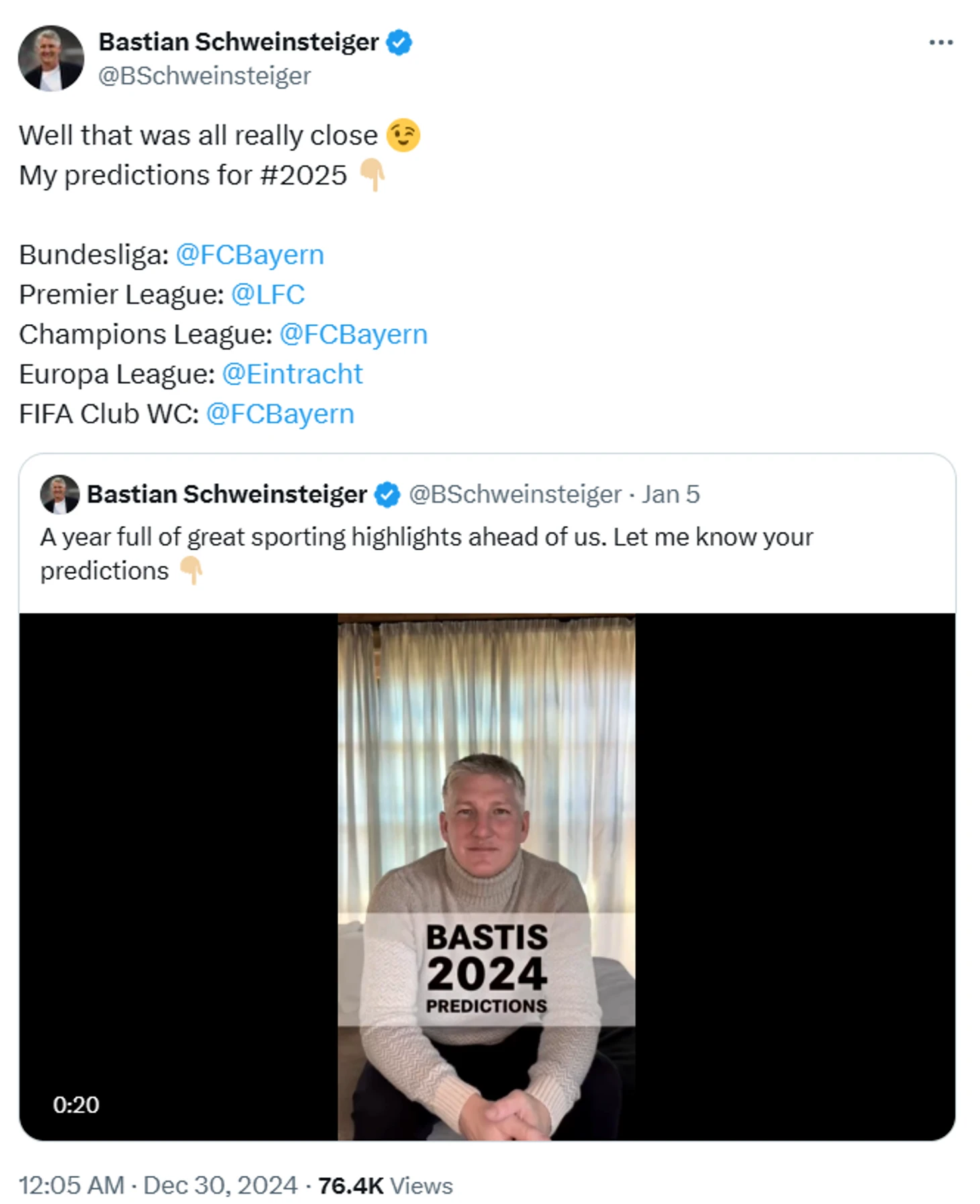 🎥 Швайнштайгер дал прогноз на футбольные итоги 2025-го! Из прошлогоднего предсказания Басти не сбылось ничего