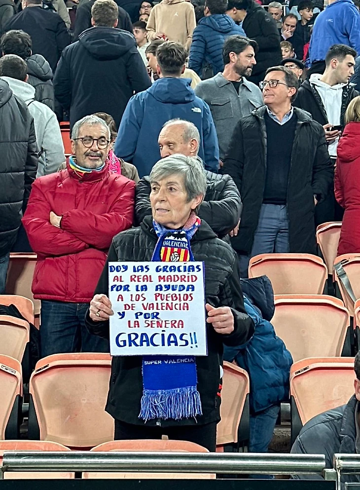 А вот сеньора с трогательным плакатом: «Я благодарю «Мадрид» за помощь жителям Валенсии и за Сеньеру. Спасибо!»