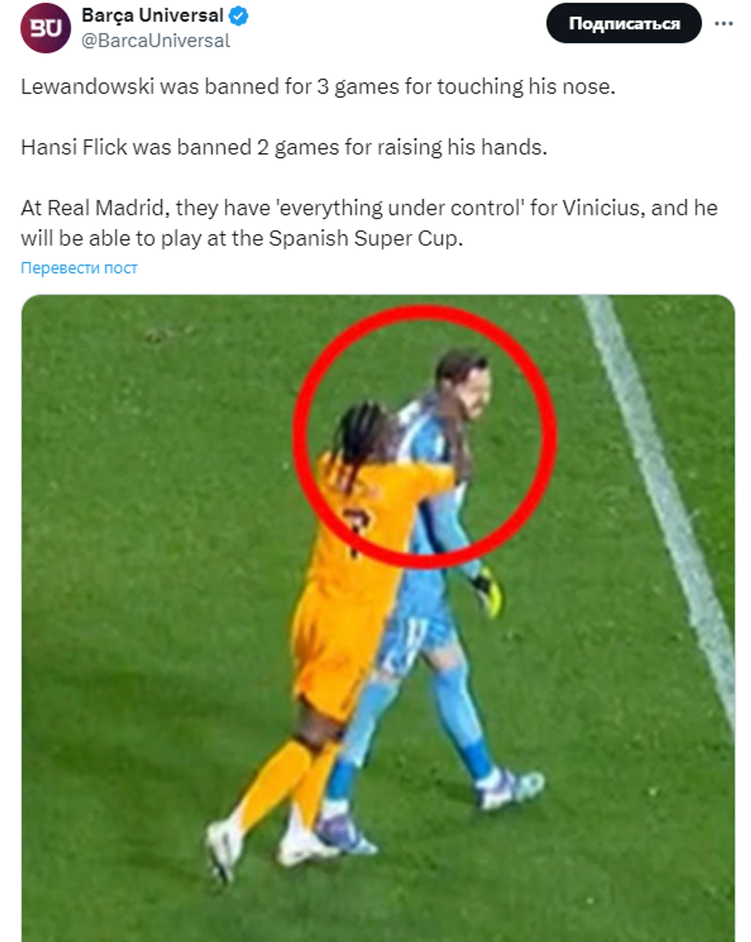 «Левандовски получил три матча за прикосновение к носу. Ханси Флика дисквалифицировали на две игры за поднятие рук. В «Мадриде» у Винисиуса «все под контролем», и он сможет сыграть в Суперкубке Испании».
