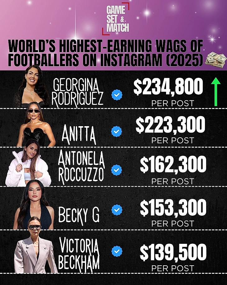Третью строчку рейтинга занимает супруга Лионеля Месси Антонелла Рокуццо. Мать троих детей пополняет семейный бюджет, сотрудничая со Spotify, Tiffani, Alo Yoga и рядом других известных брендов.